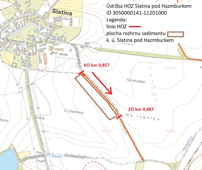 Stručný popis předmětu: Předmětem plnění je provedení udržovacích prací v k. ú. Slatina pod Hazmburkem, ORP Lovosice, povodí Labe. Posečení a vyhrabání divokého porostu, vodního rostlinstva a rákosu z profilu HOZ. Posečený porost bude z průtočného profilu vyhrabán a zlikvidován vhodným ekologickým způsobem v souladu se zákonem o odpadech č. 541/2020 Sb., v platném znění. Ve vymezeném úseku HOZ bude provedeno čištění profilu od nánosu splavené ornice (sedimentu). Vytěžená splavená ornice bude po odvodnění rozprostřena na půdních blocích 4202/4 a 4202/8 v k. ú. Slatina pod Hazmburkem ve vrstvě max 10 cm. Udržovací práce budou provedeny na jednom objektu stavby vodního díla – hlavní odvodňovací zařízení HOZ v celkové délce 0,370 km, k zajištění provozuschopnosti a obnovení funkčnosti HOZ v majetku státu v příslušnosti hospodařit SPÚ.