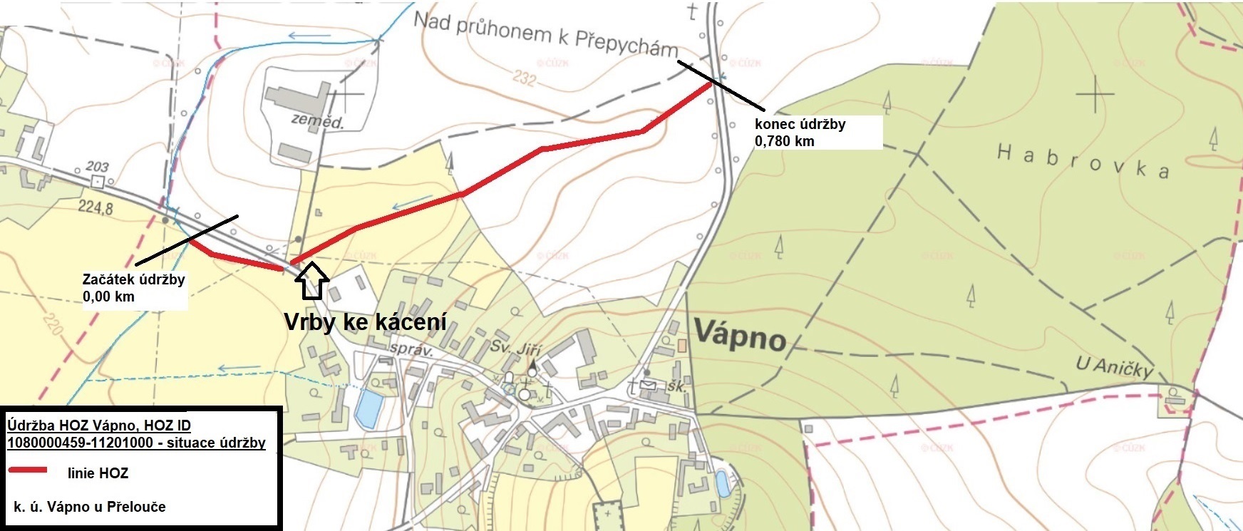 Stručný popis předmětu: Předmětem této veřejné zakázky je poskytování služeb - provedení udržovacích prací v k.ú. Vápno u Přelouče, obec Vápno, ORP Přelouč, Pardubický kraj – zajištění vytyčení inženýrských sítí, sečení divokého porostu a vodního rostlinstva včetně vyhrabání a ekologické likvidace v souladu se zákonem o odpadech č. 541/2020 Sb., v platném znění, odstranění skupin keřů černého bezu a vrb včetně pařezů, které budou zlikvidovány jako neupotřebitelná dřevní hmota v souladu se zákonem o odpadech č. 541/2020 Sb., v platném znění. Dále dojde ke kácení 8 ks vrby bílé, které jsou v majetku ČR-SPÚ a budou odprodány zhotoviteli akce. Na závěr dojde k odstranění nánosu sedimentu a jeho předání zhotoviteli akce s možností využití na plochu ZPF či ostatní plochu v souladu se zákonem o odpadech č. 541/2020 Sb., v platném znění. Z profilu HOZ budou odvezeny betonové prefabrikáty a ekologickým způsobem zlikvidovány v souladu se zákonem o odpadech č. 541/2020 Sb., v platném znění. Práce budou provedeny na 1 objektu stavby vodního díla – hlavní odvodňovací zařízení (HOZ) v celkové délce 0,780 km, k zajištění provozuschopnosti a obnovení funkčnosti HOZ v majetku státu a příslušnosti hospodařit SPÚ.