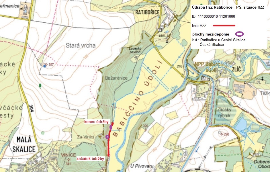 Předmětem plnění veřejné zakázky je provedení udržovacích prací v k.ú. Česká Skalice, obec Česká Skalice, ORP Náchod, Královéhradecký kraj - sečení divokého porostu a vodního rostlinstva včetně vyhrabání a ekologické likvidace v souladu se zákonem o odpadech č. 541/2020 Sb., v platném znění, odstranění křovin a stromů včetně ekologické likvidace nevyužitelné dřevní hmoty v souladu se zákonem o odpadech č. 541/2020 Sb., v platném znění, odstranění nánosu sedimentu s jeho přemístěním na mezideponii k gravitačnímu odvodnění (odkapání) s následným odvozem k ekologické likvidaci v souladu se zákonem o odpadech č. 541/2020 Sb., v platném znění, osetí travním semenem profilu HZZ, plochy mezideponie a ploch lučního porostu poškozených pojezdem techniky.